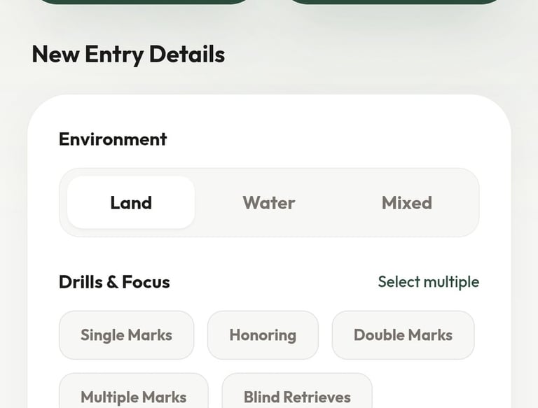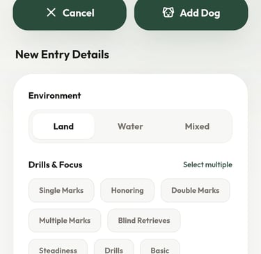 With the Training Log, every session becomes a building block toward your dog’s success. Simply select your dog, log the type of work—marks, blinds, or drills—and rate the session with an easy 1–5 star system. But this isn’t just a log… it’s your training journal.