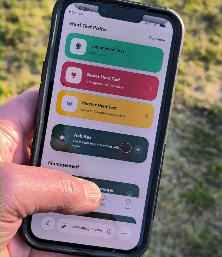 Inside the app, each hunt test level—Junior, Senior, and Master—is broken down into a complete training roadmap. No more guessing what judges are looking for or wondering if you’re truly ready.